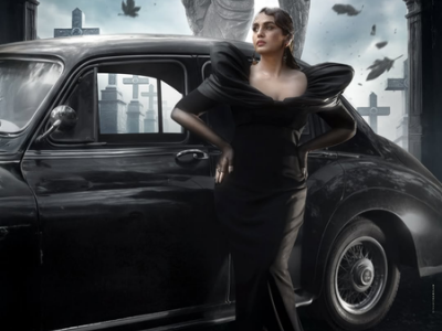 The first look of Huma as Elizabeth shows her in a graveyard setting, with weathered tombstones and looming stone angels framing the background. Standing beside a sleek vintage black car, she was seen wearing an elegant off-shoulder black ensemble with dramatic sleeves.
