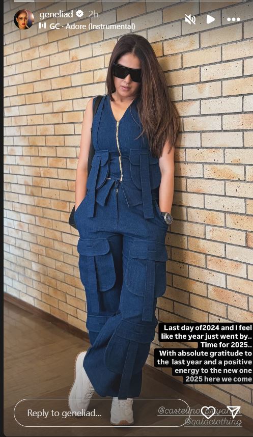 Sharing a picture of herself in a blue jumpsuit, Genelia wrote, "Last day of 2024 and I feel like the year just went by...time for 2025. With absolute gratitude to the last year and a positive energy to the new one. 2025 here we come."