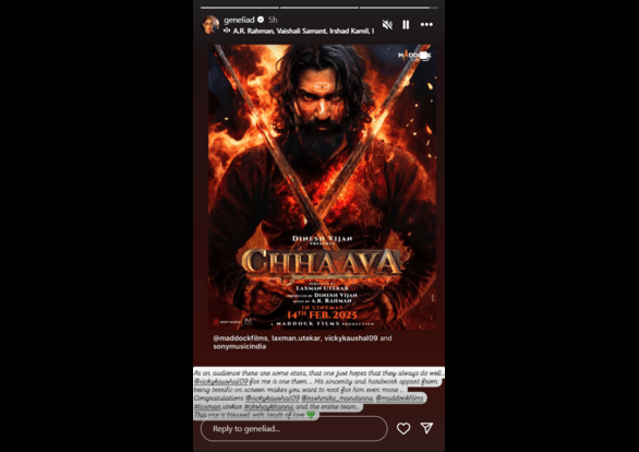 Actor Genelia Deshmukh has praised Vicky Kaushal’s performance in Chhaava, calling him a star known for his sincerity and hard work. She shared her reaction on Instagram after watching the film, which is based on the life of Maratha king Chhatrapati Sambhaji Maharaj.