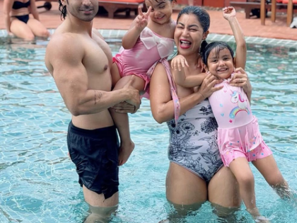 The carousel post begins with a heartwarming pool moment where Gurmeet is seen holding one of their daughters while Debina, dressed in a stylish swimsuit, lifts the other.