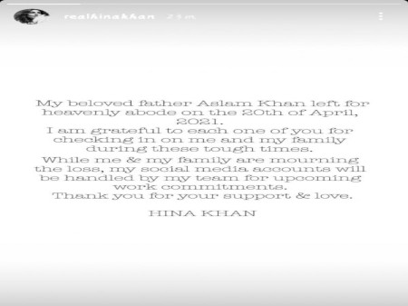 Popular actor Hina Khan’s father passed away on Tuesday following a cardiac arrest. The actor, who was shooting in Kashmir for a music video, rushed back to Mumbai following her father’s demise. On Saturday, the actress took to her Instagram shared a statement on social media and revealed that she will be taking a break social media amid this period of mourning. The Naagin star wrote, “My beloved father Aslam Khan left for heavenly abode on the 20th April 2021. I am grateful to each one of you for checking in on me and my family during these tough times. While me and my family are mourning the loss, my social media accounts will be handled by my team for upcoming work commitments. Thank you for your support & love.” Hina, who was extremely close to her father used to often share pictures and videos featuring her father.