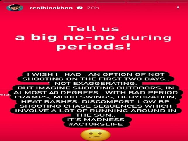 Actress Hina Khan has opened up about how if only she had an option of not shooting during the first two days of periods and described it as “madness.” The actress mentioned that it is maddening to shoot during periods especially when it requires a lot of running sequences. “I wish I had an option of not shooting on the first two days.. not exaggerating. But imagine shooting outdoors, in almost 40 degrees, with bad period cramps, mood swings, dehydration, heat rashes, discomfort, low BP, shooting chase sequences with involve a lot of running around in the sun, it’s madness,” she wrote and used the hashtag ‘actors life’.