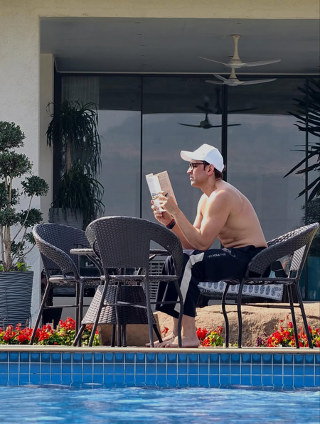 The images showed the actor immersed in Flow by Mihaly Csikszentmihalyi, whose work on flow has shaped thinking across art, sport and performance, while his boys enjoyed time in the pool. Another frame featured Hrithik working out on the lawn, soaking in the calm of his surroundings.