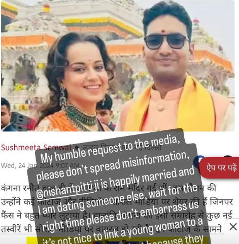 Kangana posted a news piece in which she was linked with Nitish Pitti and said, "My humble request to the media: please don't spearhead misinformation. @nishantpatti ji is happily married and I am dating someone else. Wait for the right time. Please don't embarrass us. It's not nice to link a young woman to a new man every day just because they clicked pictures together. Please don't do this,"