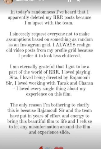 Now clarifing all the rumors, Alia Bhatt on her Instagram released a statment which reads, "In today's randomness, I've heard that I apparently deleted my RRR posts because I'm upset with the team. I sincerely request everyone not to make assumptions based on something as random as an Instagram grid. I ALWAYS realign old video posts from my profile grid because I prefer it to look less cluttered."