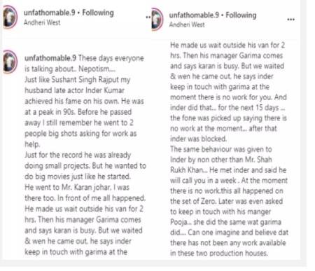 The tragic demise of Sushant Singh Rajput has exposed some of the ugly truth of Bollywood Now, late actor Inder Kumar's wife Pallavi has also taken to social media to call out Karan Johar and Shah Rukh Khan of destroying her late husband's career. She has shared a long note on her Instagram account blaming Bollywood bigwigs of giving false hopes. Pallavi Inder's wife stated, the actor wanted to do big movies and that he had approached Karan Johar for the same. However, as per her allegations, he was made to wait for almost two hours outside the filmmaker’s van post which his manager informed them that he was busy. However, he did come out later on and asked Inder to keep in touch.