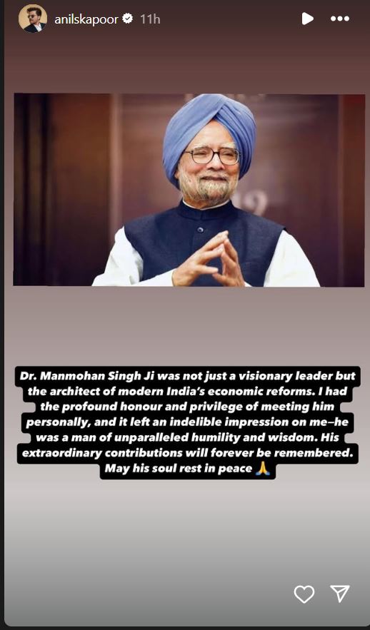 Anil Kapoor on Instagram wrote, "Manmohan Singh Ji was not just a visionary leader but the architect of modern India's economic reforms. I had the profound honour and privilege of meeting him personally, and it left an indelible impression on me-he was a man of unparalleled humility and wisdom. His extraordinary contributions will forever be remembered. May his soul rest in peace."