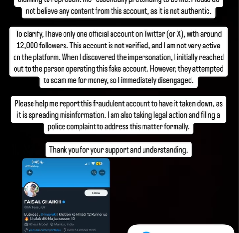 Through his Instagram stories, Faisal detailed the incident and urged his followers to report the fake account. In a statement, he clarified, "I have only one official Twitter account with about 12,000 unverified followers. While I'm not very active on the platform, I want to assure fans that any information from the impersonator's account is false."