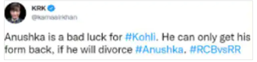 Former India captain Virat Kohli, currently playing for Royal Challengers Bangalore in the Indian Premier League has been terribly out of sorts with the bat in hand. While everyone is concerned about Virat's form, Kamaal R Khan's opinion on the ex-captain of Indian cricket team is receiving a lot of criticism as he blamed his wife Anushka Sharma for his bad form. The Deshdrohi took to his Twitter and wrote, “Anushka is bad luck for #Kohli. He can only get his form back if he will divorce #Anushka. #RCBvsRR.”