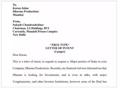 Sukesh Chandrashekhar sent this "Letter of Intent" to Dharma Productions and Karan Johar through the legal firm Anantam. The letter states that Dharma Productions is looking for investors. His financial advisor informed him that Dharma Productions has been in talks with several major companies regarding this. Sukesh’s company, LS Holdings, is registered in the British Virgin Islands, and they are interested in online gaming, mining, and corporate connections.