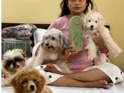 Sharing a candid picture surrounded by four energetic pups, an ardent animal lover Jaya joked that while her footwear didn’t survive the chaos.