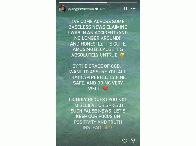 Kajal Aggarwal Accident News: Actress Kajal Aggarwal on Monday dismissed rumours that she had been injured in an accident, calling the viral claims “baseless” and “absolutely untrue.” Reports of a serious accident began circulating on social media, sparking concern among her fans. Several even posted messages of support and prayers. Kajal issued a clarification on her official handles, assuring fans that she is “perfectly fine, safe and doing very well.” She urged people not to circulate misinformation and asked them to focus on positivity and truth.