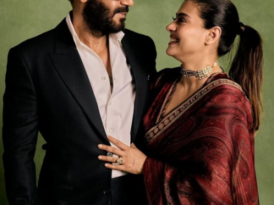 The picture features the gorgeous couple posing together against a muted green backdrop. Ajay Devgn is seen dressed in a deep dark black suit paired with a white shirt and glasses, sporting his signature beard. Kajol, on the other hand, looks stunning in a maroon saree with intricate detailing, styled with a sleek ponytail and a statement choker necklace. The two are seen looking at each other with warm smiles and love.