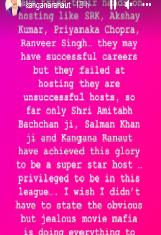 Taking her Instagram the actress wrote, “Many successful actors have tried their hands on hosting like SRK, Akshay Kumar, Priyanka Chopra, Ranveer Singh… they may have successful careers but they failed at hosting they are unsuccessful hosts, so far only Shri Amitabh Bachchan Ji, Salman Khan Ji, and Kangana Ranaut have achieved this glory to be a superstar host… privileged to be in this league.”