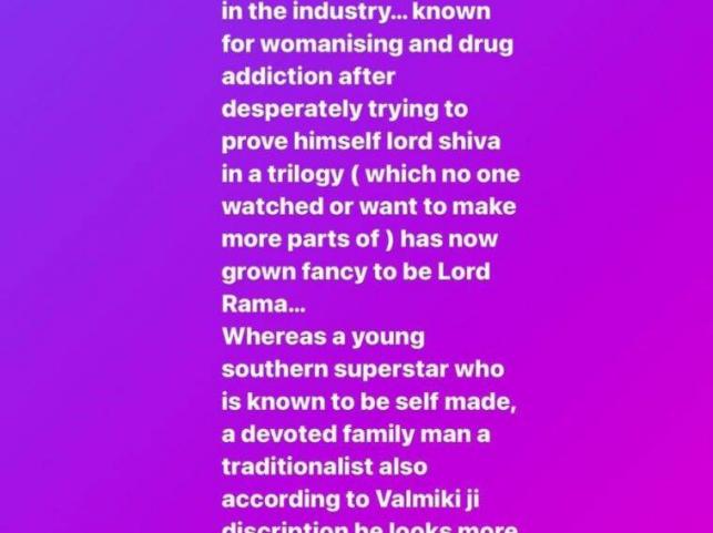 Criticizing the movie makers for having Ranbir play lord Rama the Manikarana actress wrote, “Recently I am hearing news about another coming up Bolly Ramayana… Where a skinny white rat (so-called actor) who desperately needs some sun tan and conscience he is infamous for doing nasty underhand PR about almost everyone in the industry… known for womanizing and drug addiction after desperately trying to prove himself Lord Shiva in a trilogy (which no one watched or want to make more parts of) has now grown fancy to be Lord Rama.”
