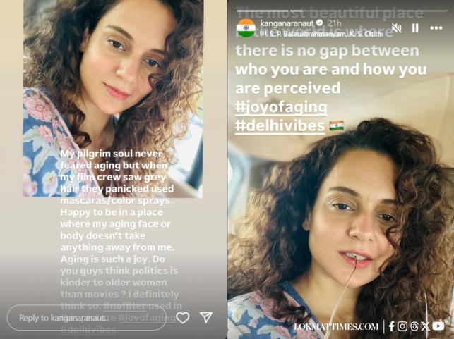 Kangana stated that while she embraces aging, her film crew panicked upon seeing her grey hair and used mascara and color sprays. Now in politics, she feels more at peace, as her appearance is no longer a critical factor in her perception. She finds joy in aging and believes politics is kinder to older women than the film industry, adding, "The most beautiful place in the world is where there is no gap between who you are and how you are perceived."