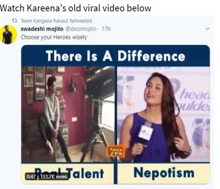 The question was then repeated to her in English, yet she didn't know what to answer as she had said, “Very scientific question! It’s a great day for us. I also want to go to space. Meri bhi yeh hi ichcha hai. Mujhe bhi le chalo saath mein (I wish for the same thing. Please take me to space as well).”Kareena's video has been clubbed with Sushant's video wherein he's passionately explaining about his telescope and the slug of the video reads 'Real talent' for Sushant and 'nepotism' for Kareena. For the unversed, after the demise of Sushant Singh Rajput, Kangana has called out industry bigwigs for destroying Sushant's career. For the unversed, Sushant died of suicide on June 14 at his Bandra residence in Mumbai. Check out the Twitter post here...