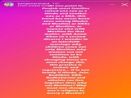 Actress Kangana Ranaut has shared her thoughts on Aamir Khan and Kiran Rao's much publicized divorce announcement. The Queen actress wrote, "At one point In Punjab most families raised one son as a Hindu and another one as a Sikh, this trend has never been seen among Hindus and Muslims or Sikhs or Muslims, or anyone else with Muslims for that matter, with Aamir Khan sir's second divorce I wonder in an interfaith marriage why children come out only Muslims why woman can not continue to be Hindu, with changing times we must change this, this practice is archaic and regressive... if in one family if Hindu, Jain, Buddhist, Sikh, RadhaSwami and atheists can live together then why not Muslims? Why must one change one's religion to marry a Muslim?