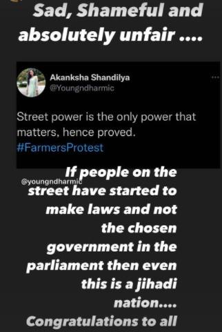 Sharing a person's tweet about the repeal, Kangana on her Instagram wrote, "Sad, shameful, absolutely unfair. If people on the streets have started to make laws and not the chosen government in the Parliament, then even this is a jihadi nation. Congratulations to all who wanted it like this."