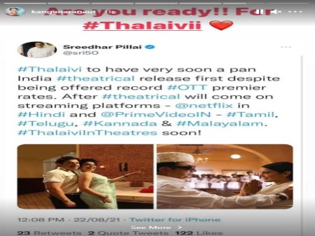 Kangana’s Thalaivi is all set to become the second major film to hit the theatres after Akshay Kumar’s Bell Bottom. Kangana confirmed a post by a media person, who wrote that Thalaivi was readying itself up for a pan India theatrical release 'very soon.' He even added that it had decided to go to the theatres despite being offered a record price by Over-the-Top platforms. He also stated that after the theatrical release, the Hindi version will hit Netflix and the other versions will be premiered on Amazon Prime. Thalaivi has been delayed multiple times due to the COVID-19 pandemic. It was first scheduled to release on June 26, 2020. However, the rise of COVID-19 last year led to the makers postponing the film. Thalaivi is directed by AL Vijay and also star Arvind Swamy is the role of former Tamil Nadu CM MG Ramachandran, Madhoo, among others.