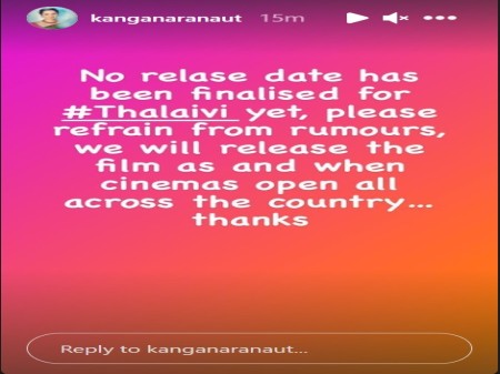 Kangana Ranaut’s upcoming film Thalaivi is one of the most anticipated films of the year. The release of the film however, has been postponed owing to the COVID 19 situation. Soon reports surfaced that the Jayalalitha biopic will be releasing in theatres soon. Now, Kangana himself, has said slammed the fake reports doing rounds online. Taking to Instagram, the actress shared a story wherein she mentioned, “No release date has been finalised for #Thalaivi yet, please refrain from rumours, we will release the film as and when cinemas open all across the country thanks..”
