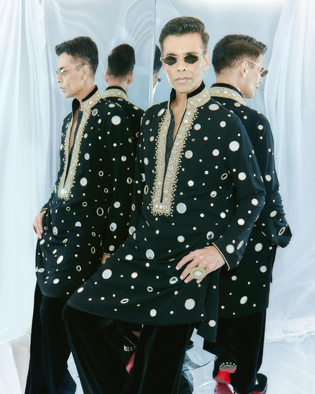 In the photos, KJo could be seen dressed in a stylish black kurta pyjama that he paired with chic sunglasses and ring. The pictures show him striking different poses for the camera.