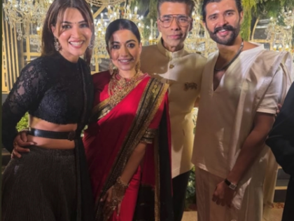 The picture shared by Karan, features Kriti Sanon standing beside Rashmika Mandanna and Vijay Deverakonda, while Karan Johar is seen standing in between the couple.