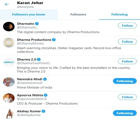 This unexpected bashing on social media has forced the superstar director to mysteriously unfollow hundreds of accounts on Twitter. The Takht director is now only following eight Twitter accounts, out of which four belong to his production Dharma and its CEO Apoorva Mehta. As for the other four, the accounts belong to three of the biggest superstars of India - Amitabh Bachchan, Shah Rukh Khan and Akshay Kumar, and Indian Prime Minister Narendra Modi. Earlier Karan's Instagram following took a massive hit after his insta numbers went from 11 million to 10.9 million within a matter of 20 minutes. Check out the latest screenshot of Karan Johar's Twitter account below.