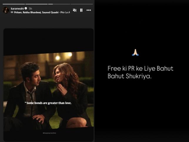 On Wednesday, January 28, 2026, Karan took to Instagram and posted a story which said, "Free PR ke liye bahut bahut shukriya". In the next post, he shared a picture of Kalki Koechlin and Ranbir Kapoor from the film Yeh Jawaani Hai Deewani which said, "Some bonds are greater than love". While many fans were happy to hear about the wedding rumours, Karan's reaction made it clear that the marriage buzz is false and there is nothing brewing between them