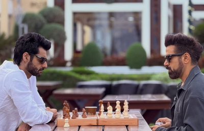Karan posted a series of photos on Instagram of himself sitting in an outdoor area with Rithvikk, playing chess with all seriousness.