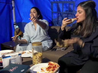 The pictures show Kareena and Rhea sitting together and indulging in pizza during what seems to be a casual hangout on a set-like setup with food boxes, plates and snacks placed on a table infront of them.