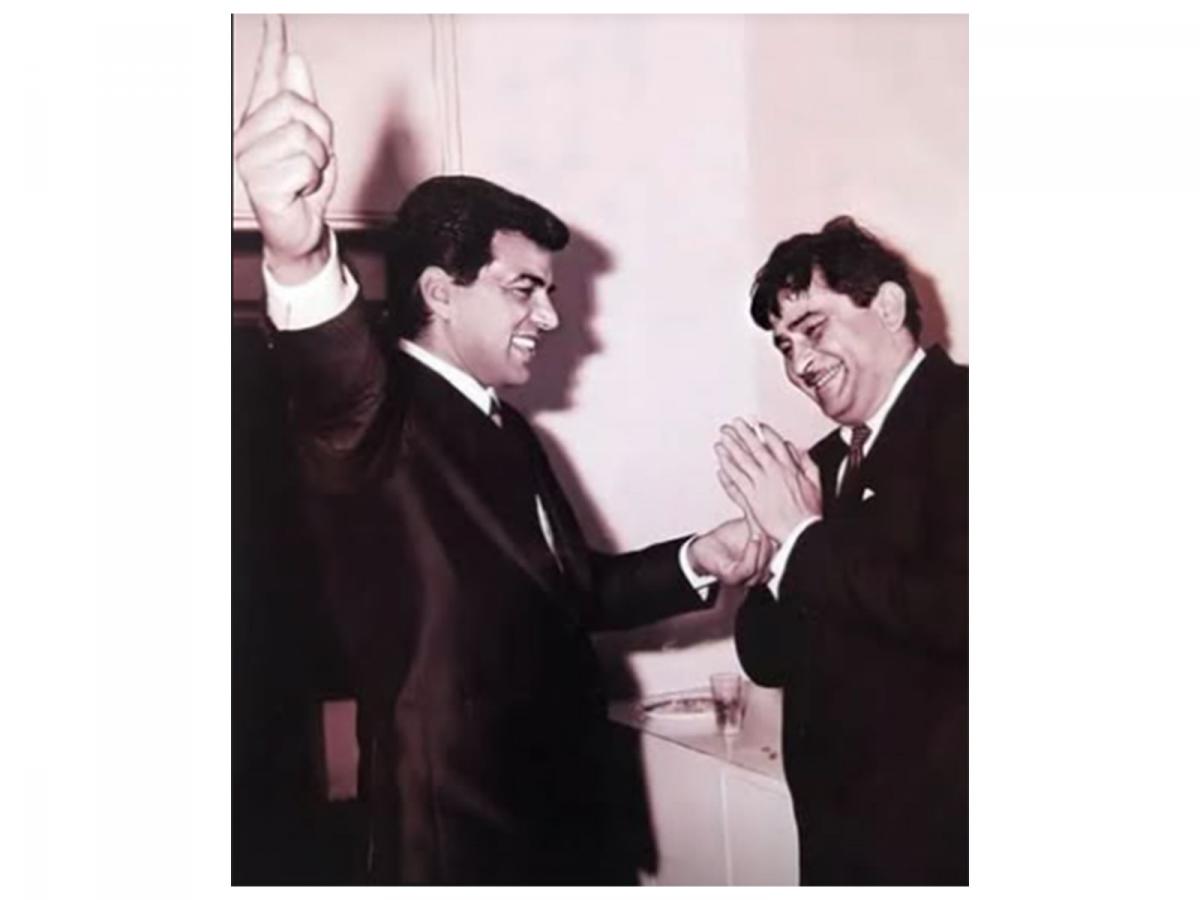 In a monochrome picture, Dharmendra and Raj Kapoor could be seen sharing smiles as they greeted each other with a tight hug.