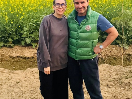 Karisma in the picture is seen smiling in a cosy casual look, standing in a scenic mustard field, posing with Saif Ali Khan.