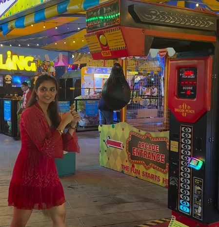 Keerthy posted a clip on her Instagram handle where she was seen having a gala time at what seemed to be a play zone. Looking adorable in a short red dress, the 'Mahanati' actress was seen giving a high-intensity punch in the video captioned, "That’s my “You really don’t wanna mess with me” face (sic)."