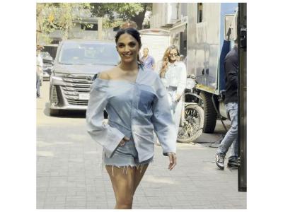 The 'Shershaah' star was dressed in denim shorts paired with a light-coloured off shoulder shirt and striking shoes. She kept her makeup minimal and her hair tied in a ponytail.