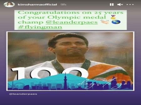 Kim Sharma recently shared a post celebrating the completion of 25 years since her rumoured boyfriend Leander Paes won a bronze medal in tennis at the Olympics. Sharing a throwback picture of Leander, Kim wrote: "Congratulations on 25 years of your Olympic medal champ @leanderpaes #flyingman."Kim and Leander have been rumoured to be seeing each other and the couple have been spotted enjoying each other's company multiple times. Last month, a restaurant-bar in Goa sparked rumours of Kim and Leander dating by sharing a picture of them enjoying a meal together.