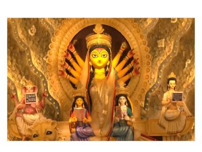 Adding to this uniqueness, the idols of Goddess Durga's children have been given symbolic embodiments. While Goddess Lakshmi is depicted holding the Barn Parichaya popular childhood book that introduces the Bengali alphabet, Lord Kartik and Lord Ganesha hold black slates, symbolising education and knowledge.