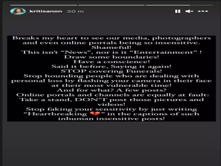The sudden and unexpected demise of Sidharth Shukla has sent shockwaves across the nation. Meanwhile, a number of celebs, hit out at media organisations for carrying out "insensitive" coverage before actor Sidharth Shukla's funeral. Now, joining the bandwagon is actress Kriti Sanon. The Heropanti actress, recently took to her social media handle to express her opinion on the insensitive media and photo coverage of the late actor’s funeral and family. She penned a strongly worded note which went on to read, “Breaks my heart to see our media, photographers and even online portals being so insensitive. Shameful! This isn’t “News”, nor is it “Entertainment”! Draw some boundaries! Have a conscience! Said it before, Saying it again! STOP covering funerals!"