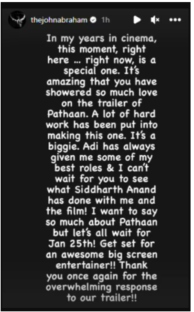 In my years in cinema, this moment, right here right now, is a special one. It's amazing that you have showered so much love on the trailer of Pathaan. A lot of hard work has been put into making this one. It's a biggie, Abraham, who made his acting debut with 2003's Jism, wrote on his Instagram Stories.