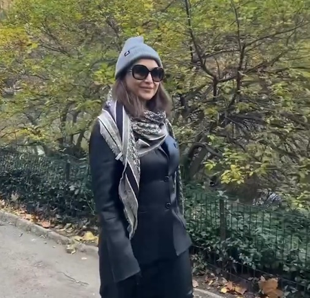 The 'Hum Aapke Hain Koun..!' actress was seen wearing a leather jacket with a matching skirt, a complementary scarf, and a woolen cap, indicating she is on a vacation at a place where the temperatures are low.