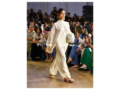 She walked the show in a flowy white drape ensemble, further accentuated with a customised hangbag with frills, which she held in her hand. She completed the look with frilled footwear and drop earrings.
