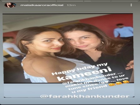 Ace choreographer, Farah Khan turned a year older today and on her birthday, the director's close friend Malaika Arora Khan penned a beautiful note on social media. Taking to her Instagram story, Malaika dropped a photo of herself with Farah from the good old days in which the two ladies could be seen posing together. Malaika is seen clad in a white dress while Farah is seen sporting a casual black outfit in the photo. As the photo was shared by Malaika, she even penned a quirky and cute birthday wish for Farah and sent her love with it on social media.