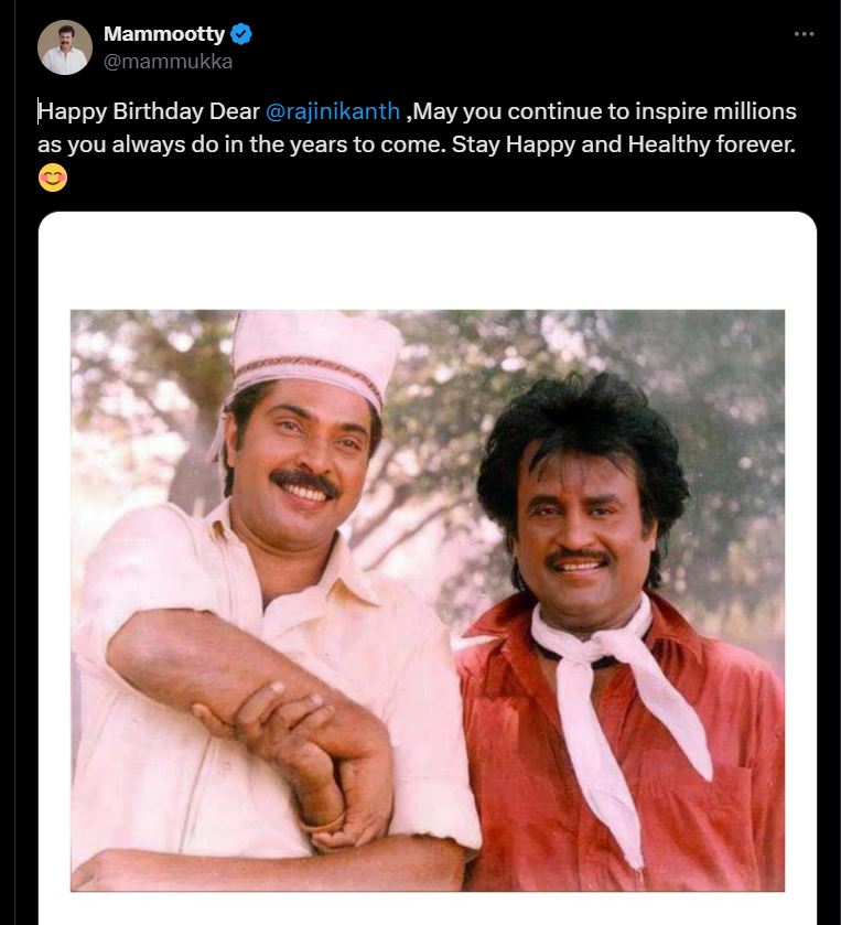 Veteran actor Mammootty wished Rajinikanth with a post on X (formerly Twitter), saying, "Happy Birthday Dear @rajinikanth, May you continue to inspire millions as you always do in the years to come. Stay Happy and Healthy forever."