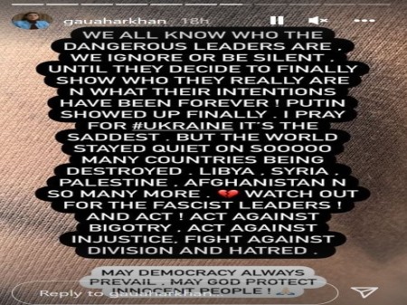 Actress Gauahar Khan has penned a long note on the Russia-Ukraine crisis. The former Bigg Boss winner took to her Instagram stories to shared her thoughts on the war. She wrote, "We All Know Who The Dangerous Leaders Are We Ignore Or Be Silent. Until They Decide To Finally Show Who They Really Are N What Their Intentions Have Been Forever! Putin Showed Up Finally. I Pray For #Ukraine It's The Saddest. But The World Stayed Quiet On Soooo Many Countries Being Destroyed. Libya, Syria. Palestine, Afghanistan N So Many More. Watch Out For The Fascist Leaders! And Act! Act Against Bigotry. Act Against Injustice, Fight Against Division And Hatred. May Democracy Always Prevail May God Protect Innocent People (sic)."