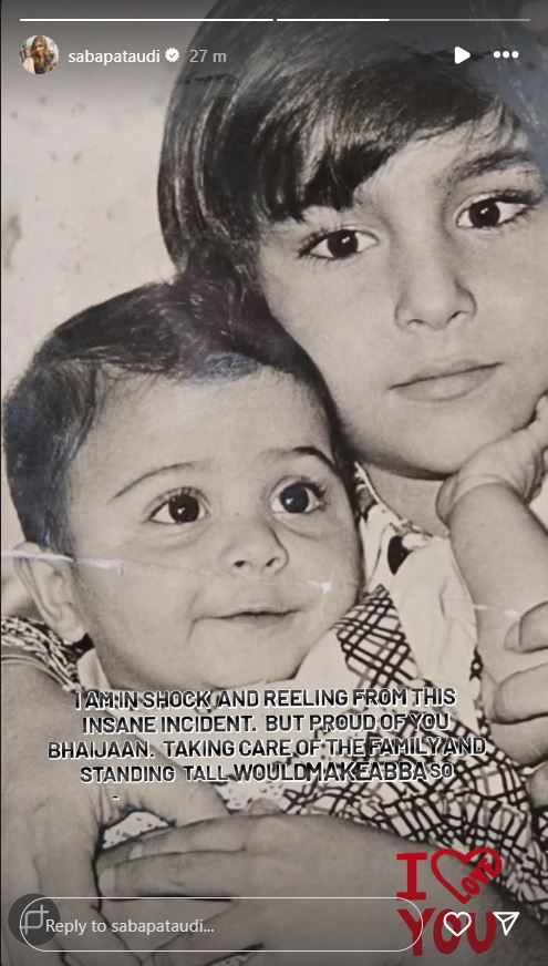 Saba took to her Instagram Stories to post a black-and-white childhood picture with Saif, accompanied by an emotional note. In her message, she shared her "shock" about the incident and also lauded her brother for his strength.