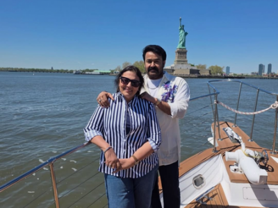 Mohanlal shared a picture of himself with his wife posing next to the Statue of Liberty on Liberty Island in New York Harbor.