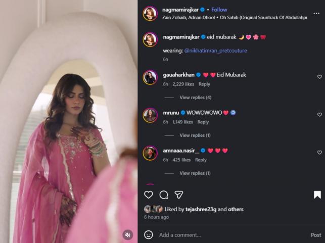 On the occasion of Eid, Nagma shared a video on Instagram in which she is seen getting ready for Eid. Clips begins with her getting ready and ends at all set for Eid party. Gauahar Khan wished Nagma "Eid Mubarak" with red heart emojis, despite Nagma not responding. This gesture suggests Gauahar remains cordial with Nagma amid speculation about Nagma's rumored breakup with Awez Darbar. Previously, Gauahar commented "PYAARI" on a post where Nagma flaunted a peach dress, prompting fans to joke about Gauahar's relationship with Awez.