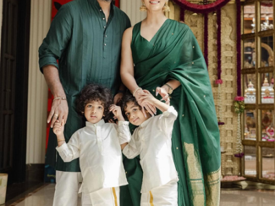 Her director husband, Vignesh Shivan, also twinned with his wife in a matching kurta. Their twin boys -Uyir Rudronil N. Shivan and Ulag Dhaivag N. Shivan also posed with their parents in matching white kurta pajamas.