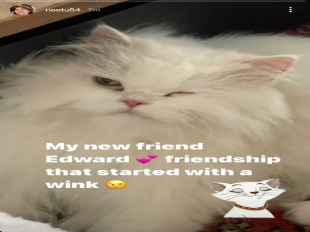 Neetu, who has been quite active on social media shared a new update on her handle on Saturday and introduced her new friend, a white cat. Taking to her Instagram handle, Neetu shared a glimpse of the feline as she befriended it. In the photo, we could see Alia's cat Edward winking at the camera and well, it seems that its friendship with Neetu began this way.