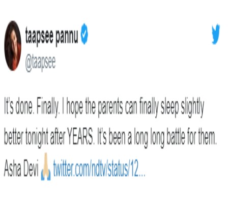Seven years after the four convicts of rape and murder of a medical student the four convicts of the brutal rape were hanged to death in Tihar Jail today morning. The executions were carried out after the 4 men exhausted every possible legal avenue to escape the gallows. Hundreds of people gathered outside the Tihar Jail and celebrated by distributing sweets. Netizens and Bollywood celebs too poured their heart out. Here are some of the reactions...